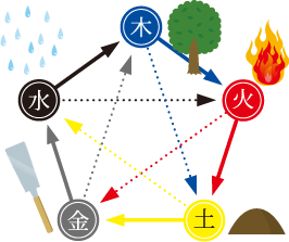 自然界のあらゆるものは「木・火・土・金・水」の5つの要素に分類でき、これらは相互に助け合ったり、抑制し合ったりすることで自然界のバランスを保っているという考え方です。助ける関係を相生、抑制する関係を相克といいます。